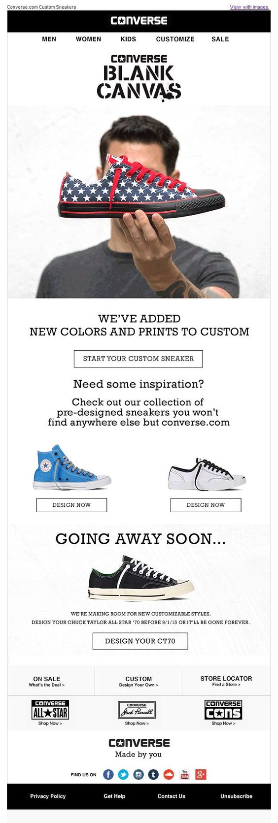 Here is an email from Converse about there custom design program. They let you know that they have added some new colors and prints to their gallery that you may use to customise your pair of Converse. They also offer links to their current collection in case you are looking for some inspiration.