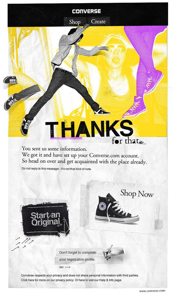 That is the “Thank you” email you get when you set up an account with Converse.com. The email design brings strong grunge flavour and offers two main calls to action on top – Shop and Create. You may choose to shop from the latest Converse collection or create a custom pair of Converse sneakers.