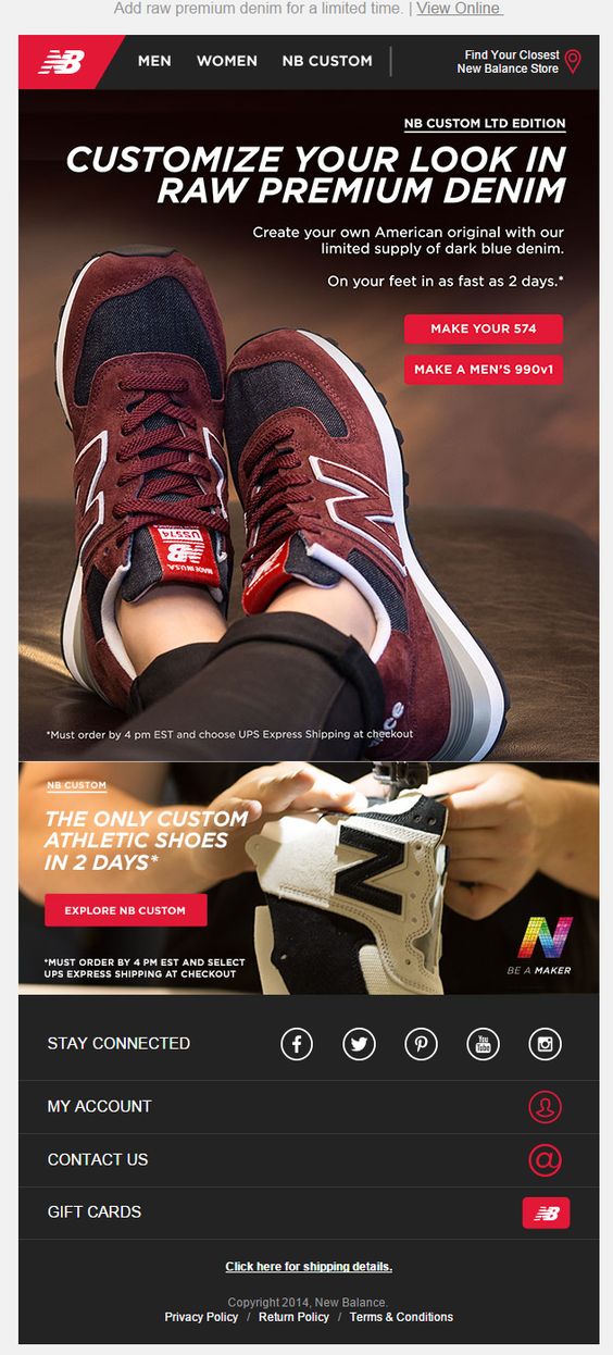 New Balance also have email advertising their custom shoes program. In this case they urge their subscribers to hurry up, as the dark blue denim they may use for their custom pair of New Balance is in limited supply. Another message they use to lure their readers into purchasing is “On your feet in as fast as 2 days”.