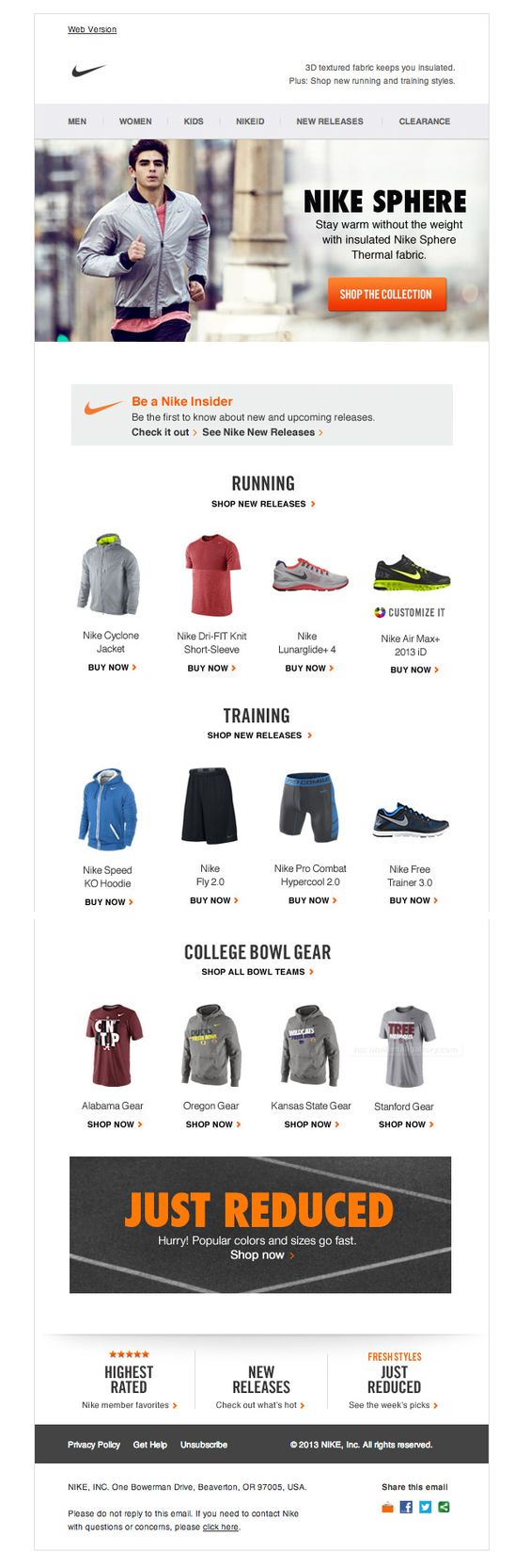 This email template from Nike focuses on those who workout outdoors. The email header offers Nike’s sportswear line made with a patented technology called Nike Sphere. A quick google search will tell you that this technology is used mainly in Nike running apparel.