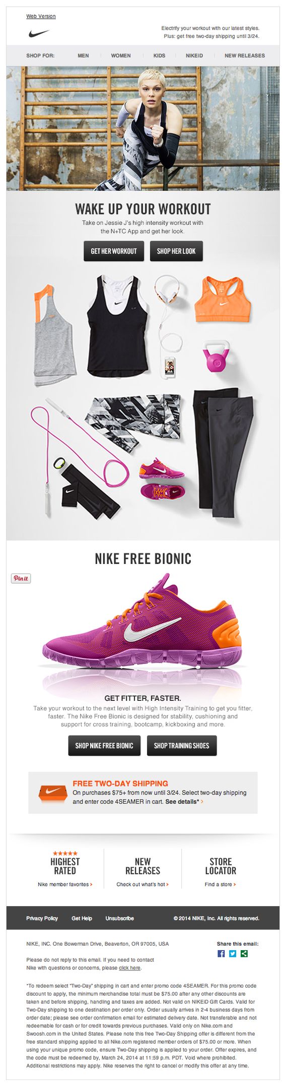 With Jessie J on top, this email template from Nike will grab instantly a fan’s attention. The English singer has her own training program and her own Nike sportswear line, which the company offers to their client with a clever call to action – Shop Her Look.