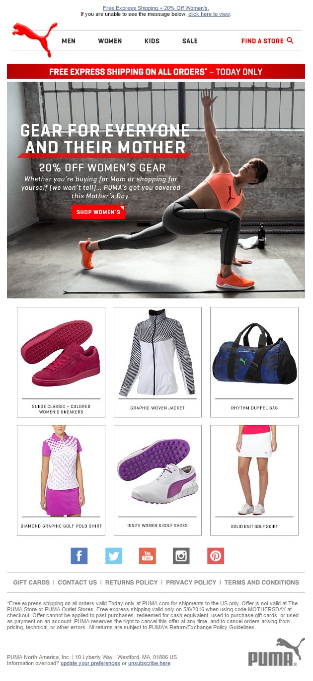A Mother’s Day email from Puma with classic layout. The top navigation is followed by a large header, which is a background image for the main message and the bright red call to action. Underneath, we have six products in two rows. All products are evenly separated and shot on white background.