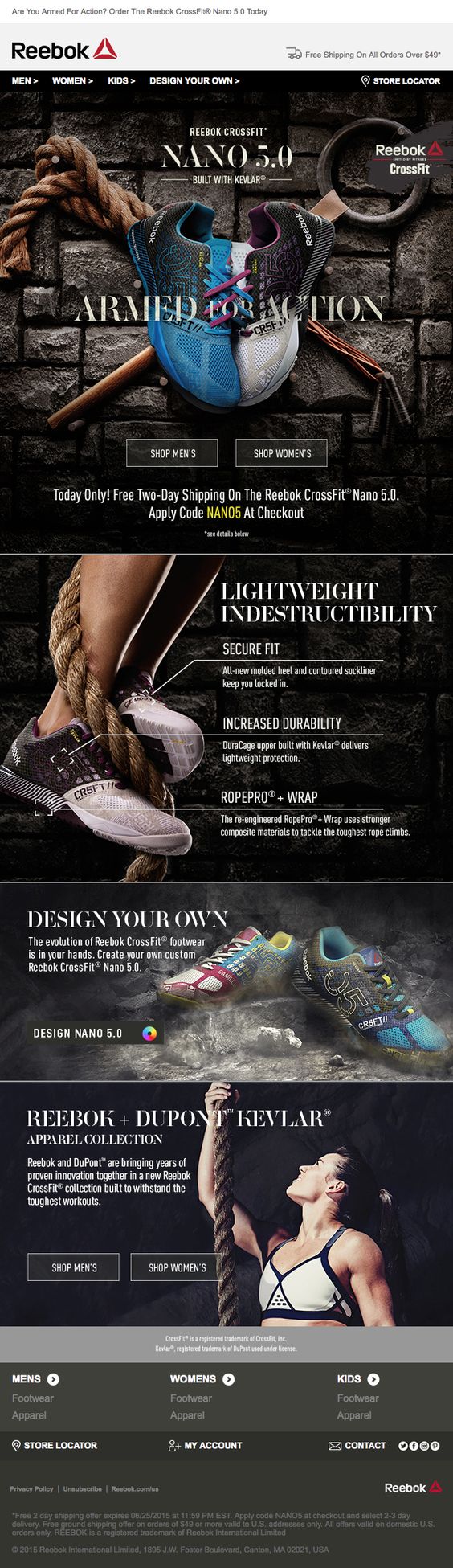 Reebok’s connection with CrossFit in recent years is very strong and that strong should be their NANO trainers made with kevlar mesh. This email template has dark design that screams toughness and durability. The main message is stated clearly in the hero image “Armed for Action”.