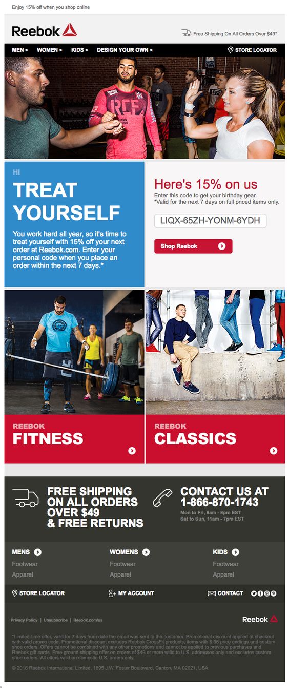 A discount email from Reebok offering 15% off on their products. The header image follows a main theme for Reebok today – Fitness. However, in the lower part of the template you have options to shop either Fitness or Classic collections. The email does not leave you wondering what to do next, as it features big, red calls to action.