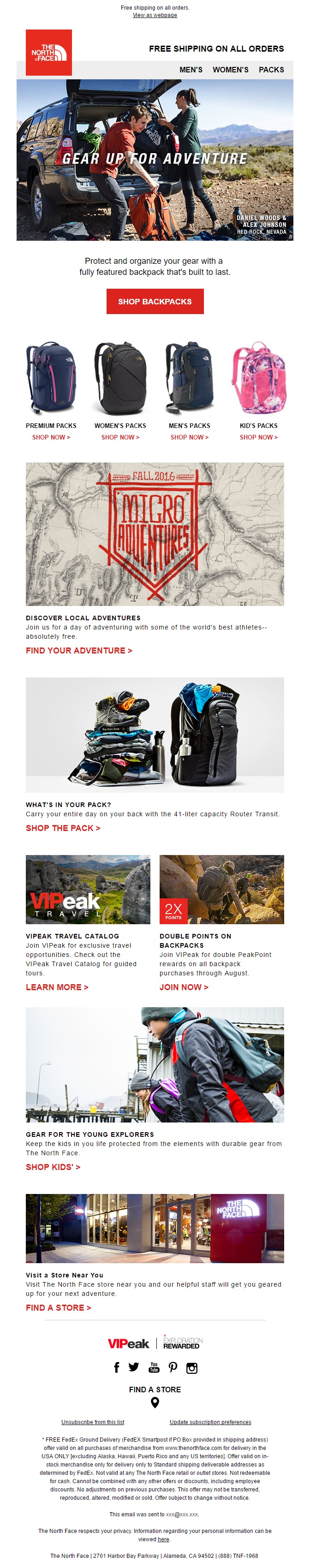 Here is a long email from The North Face with multiple call to actions. The email starts offering a line of backpacks and prompting the reader to shop for them. Beneath the fold you may also explore a store locator and adventures locator.