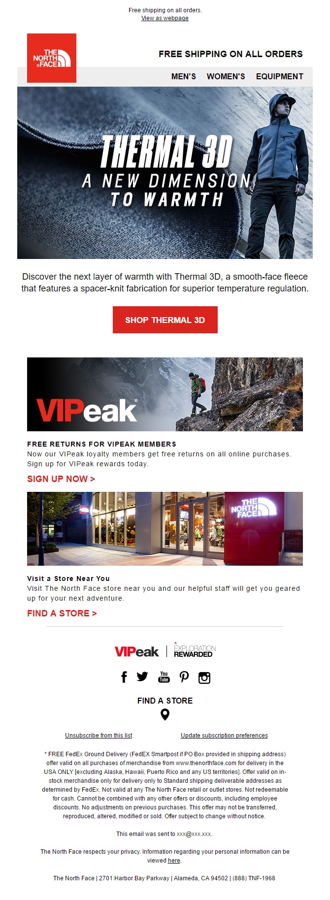 With this email The North Face introduces their subscribers to a new fabric they are using for their clothes, Thermal 3D. Store locator and offer to join their loyalty program come next. This email is much shorter and allows the reader to focus easier on the main message.