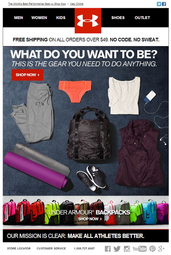 Under Armour sends this short email to their readers to offer all the essentials they need to start training. The big red Shop Now button will get them to the Under Armour website, but if they wish they may use the top menu to navigate to it too.
