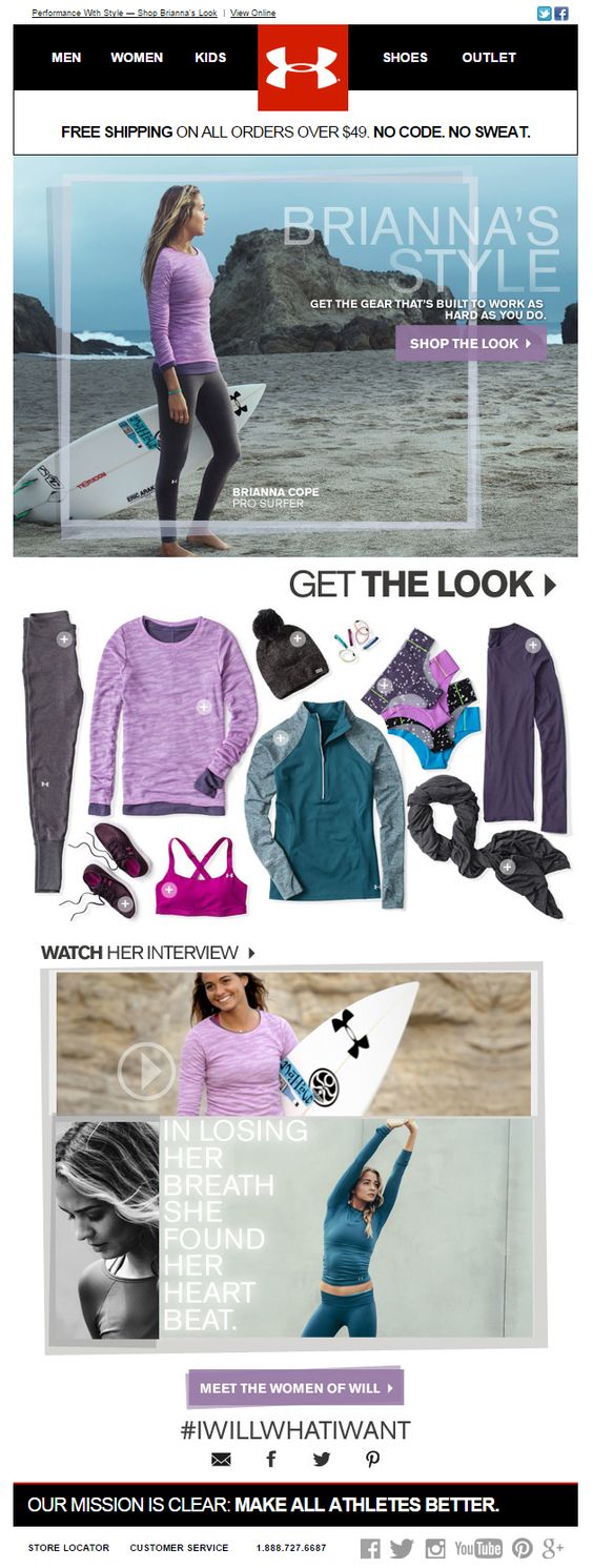 An Under Armour email offering Brianna Cope’s line of sportswear. The pro surfer is featured in the hero image with the items from her signature collection underneath. The color scheme is consistent throughout the whole email. In case you don’t know Brianna, you may get to know her from the videos linked beneath the fold.